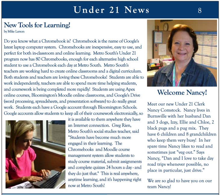 Situation: In 2012, Metro South ABE's Under 21 alternative high school had a traditional paper based curriculum. Bloomington Schools was piloting 1:1 Google Chromebooks in our middle schools.